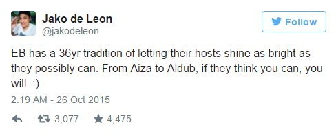 Meanwhile, his son Jako De Leon posted a tweet stating why Eat Bulaga is better than the rest. It is because the noon time show is giving opportunities to it's hosts to gain the spotlight. The evidence is clear from Aiza Seguerra up to the phenomenal AlDub.